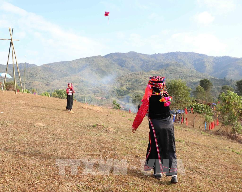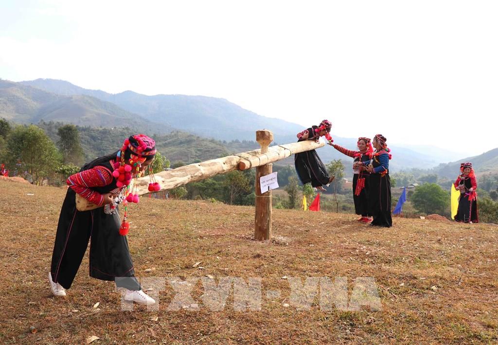 Thiếu nữ Hà Nhì tham dự hội xuân, chơi trò chơi ném còn (“lên pô pè”) trên thảo nguyên bản Tá Miếu. Ảnh: Xuân Tiến – TTXVN