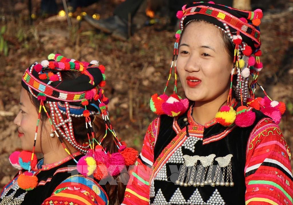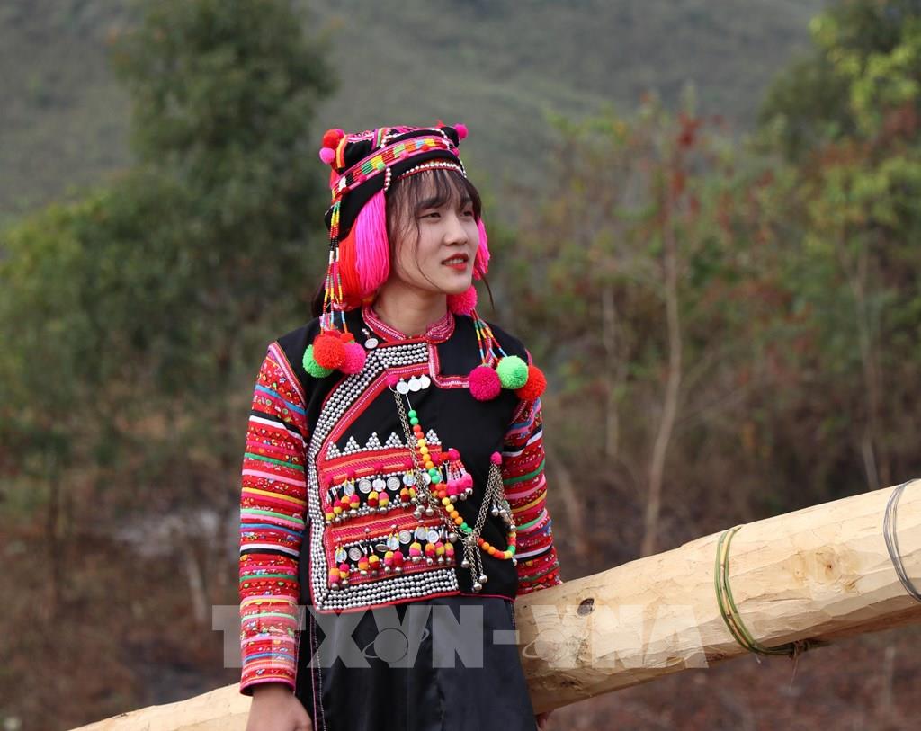 Thiếu nữ người Hà Nhì trong trang phục truyền thống khi đi chơi lễ trong dịp Tết cổ truyền Hồ Sự Chà. Ảnh: Xuân Tiến – TTXVN