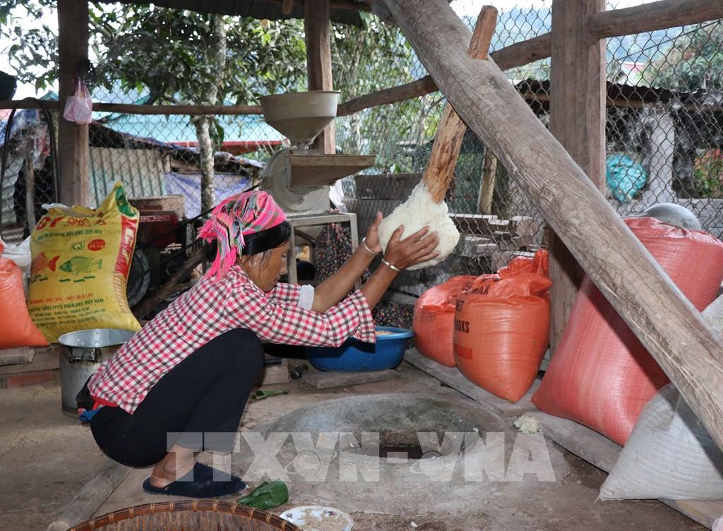 Phụ nữ Hà Nhì giã bánh dày chế biến từ nguyên liệu nếp nương có đặc tính thơm, dẻo để sử dụng trong dịp Tết và làm quà biếu khách chúc Tết gia đình. Ảnh: Xuân Tiến – TTXVN