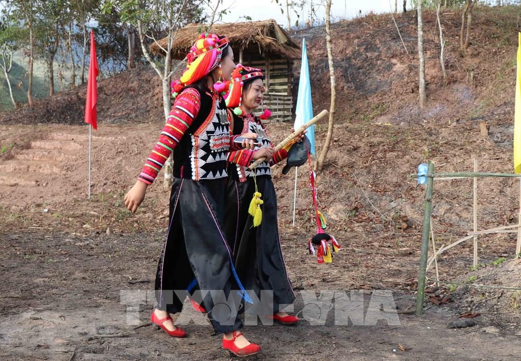 Hai thiếu nữ Hà Nhì trong trang phục truyền thống của dân tộc đang đi chúc Tết, chơi hội xuân ở bản Tá Miếu. Ảnh: Xuân Tiến – TTXVN