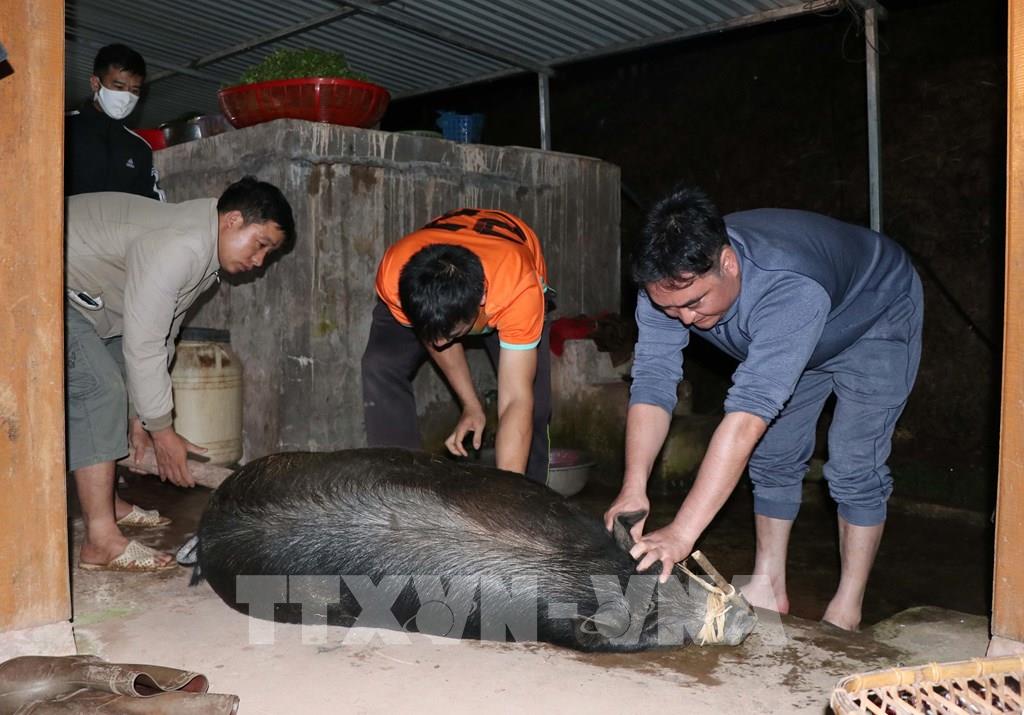 Sau khi kết thúc bữa ăn sáng với món bánh trôi, các gia đình sẽ tiến hành mổ lợn để lấy thịt làm mâm cỗ thực hiện các nghi thức cúng lễ và tạo nguồn thực phẩm dự trữ cho gia đình, chế biến thành các món ăn tiếp đãi khách trong những ngày Tết. Ảnh: Xuân Tiến – TTXVN