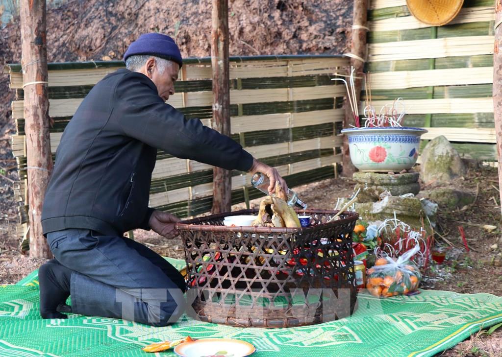 Thầy cúng thực hiện nghi thức dâng lễ vật cúng tế trong ngôi miếu trên địa bàn bản Tá Miếu (xã Sín Thầu, huyện Mường Nhé, tỉnh Điện Biên). Hoạt động này diễn thường niên mỗi khi bản làng Tá Miếu chuẩn bị bước vào Tết Cổ truyền Hồ Sự Chà. Ảnh: Xuân Tiến – TTXVN