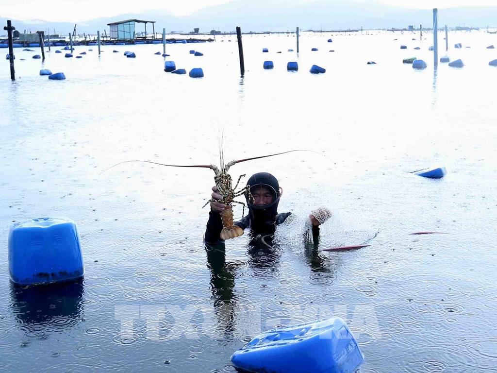 Phú Yên là một trong những địa phương phát triển mạnh nghề nuôi tôm hùm, sản lượng thu hoạch tôm thương phẩm hằng năm đứng thứ hai cả nước. Ảnh: Vũ Sinh - TTXVN