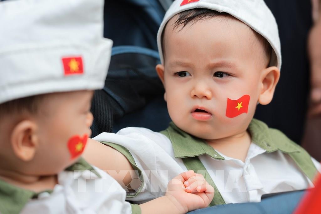 Nhiều em nhỏ tỏ vẻ thích thú khi được xem các khối diễu binh, diễu hành của lực lượng Công an thành phố Hà Nội. Ảnh: Phạm Kiên - TTXVN