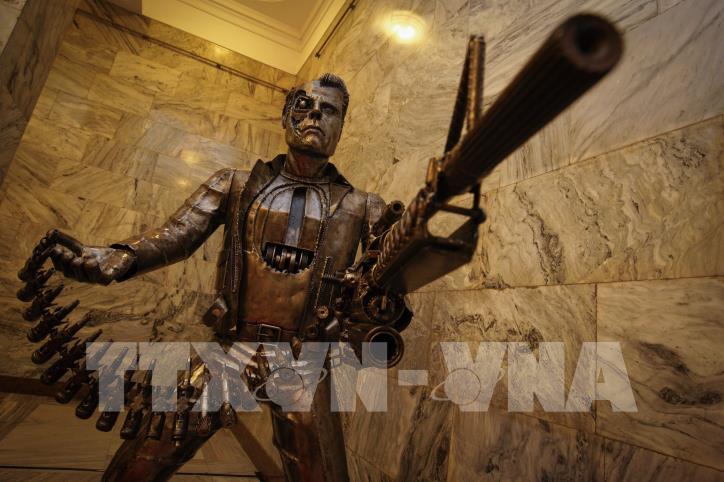 Một tác phẩm điêu khắc được làm từ kim loại phế thải trưng bày tại Phòng khoa học nghệ thuật và văn học ở thủ đô Vác-sa-va, Ba Lan ngày 27/4/2019. Ảnh: THX/TTXVN