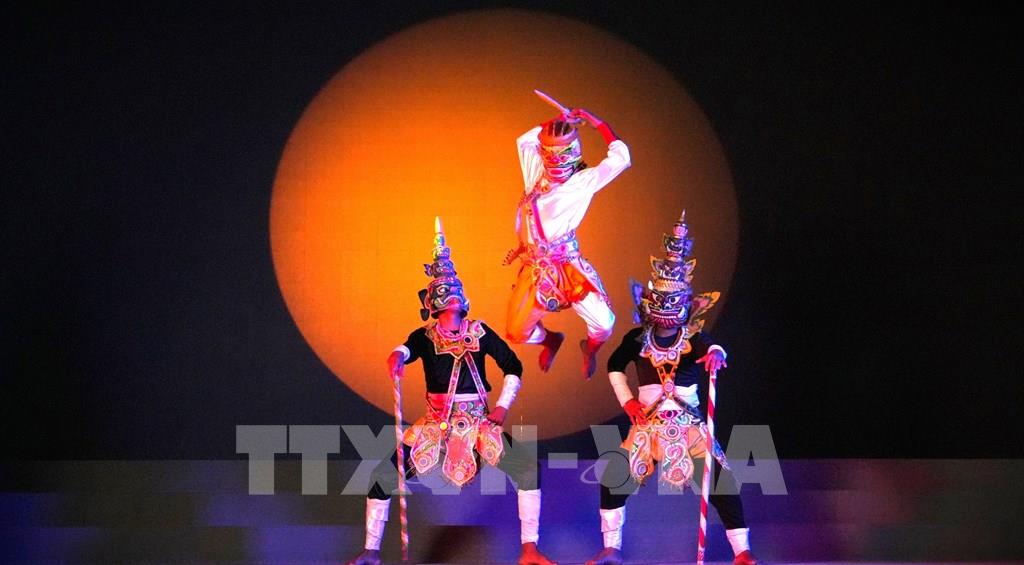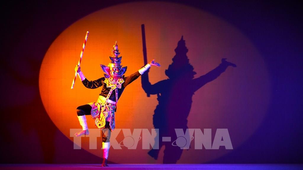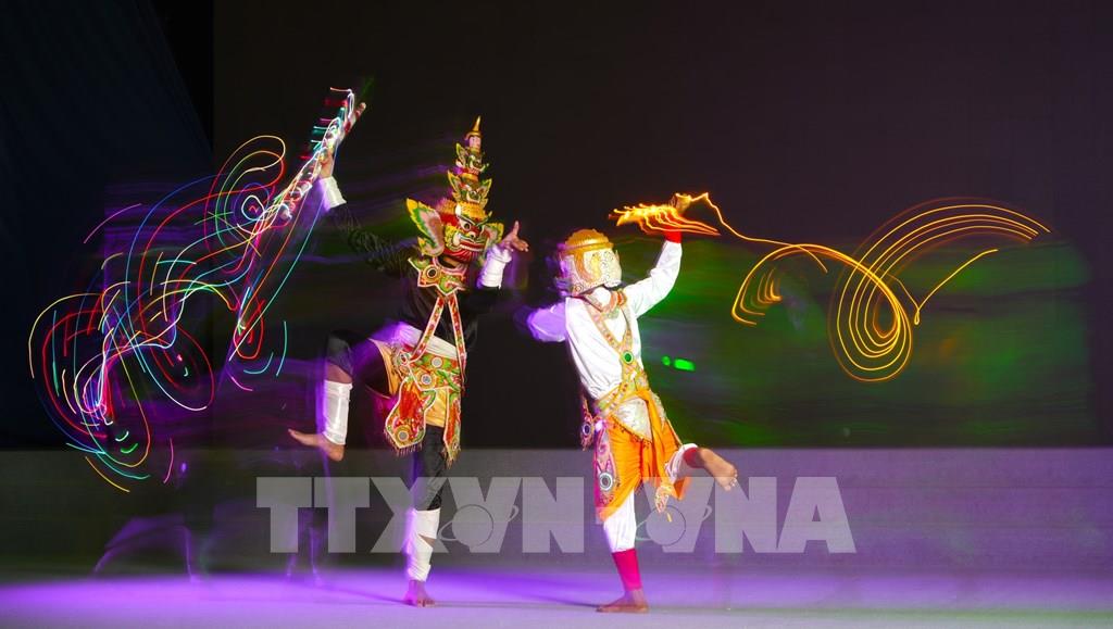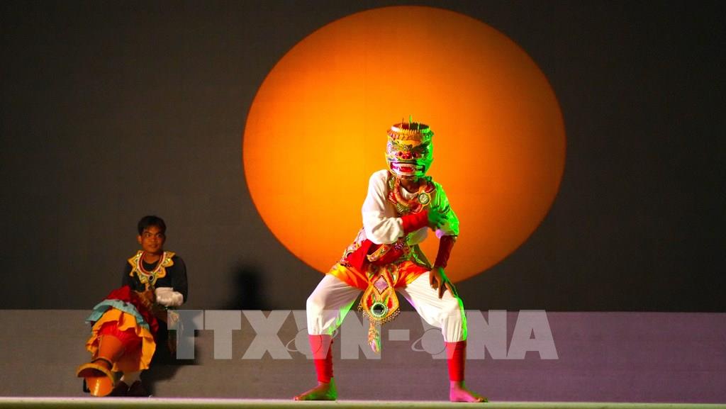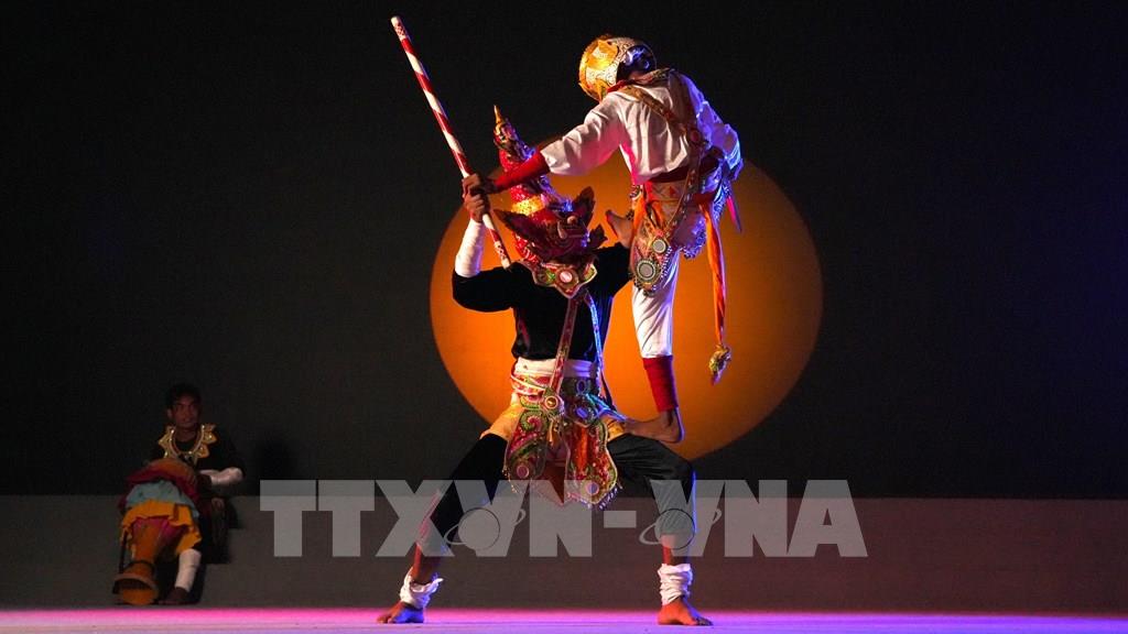 Bài múa Chằn chủ yếu sử dụng động tác cơ thể như tay, chân... thể hiện tính cách nhân vật nổi bật nhất trong sử thi Riêm Kê của Ấn Độ. Ảnh: Minh Phú – TTXVN