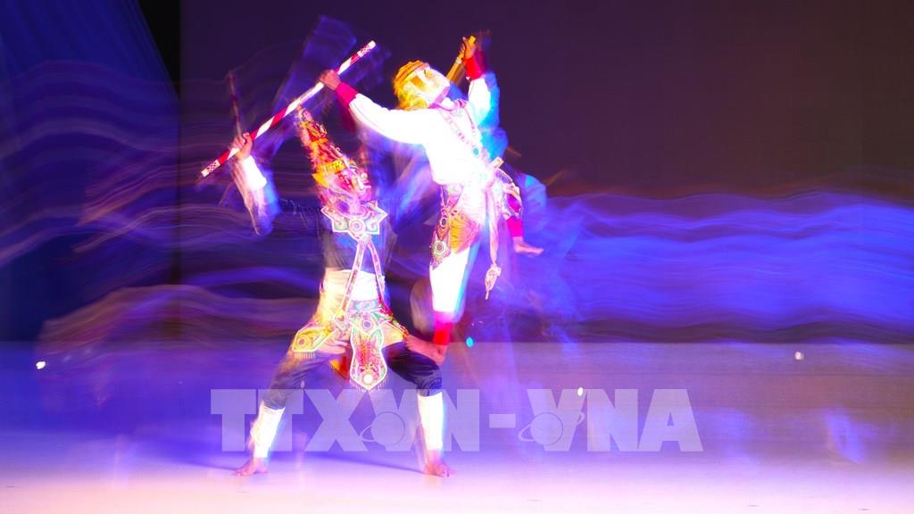 Múa Chằn kết hợp với hiệu ứng ánh sáng huyền ảo, được biểu diễn tại Trung tâm văn hóa tỉnh Tây Ninh (phường Tân Ninh, tỉnh Tây Ninh). Ảnh: Minh Phú – TTXVN