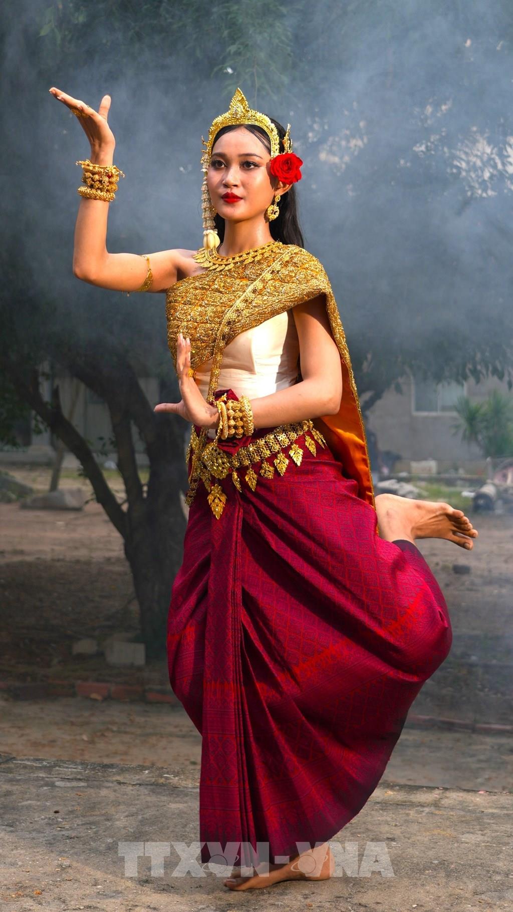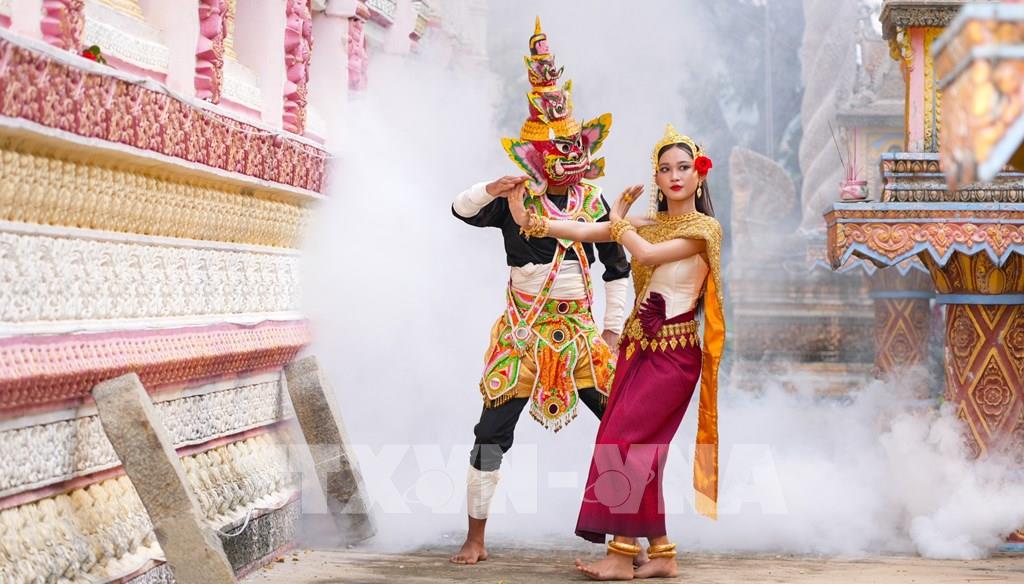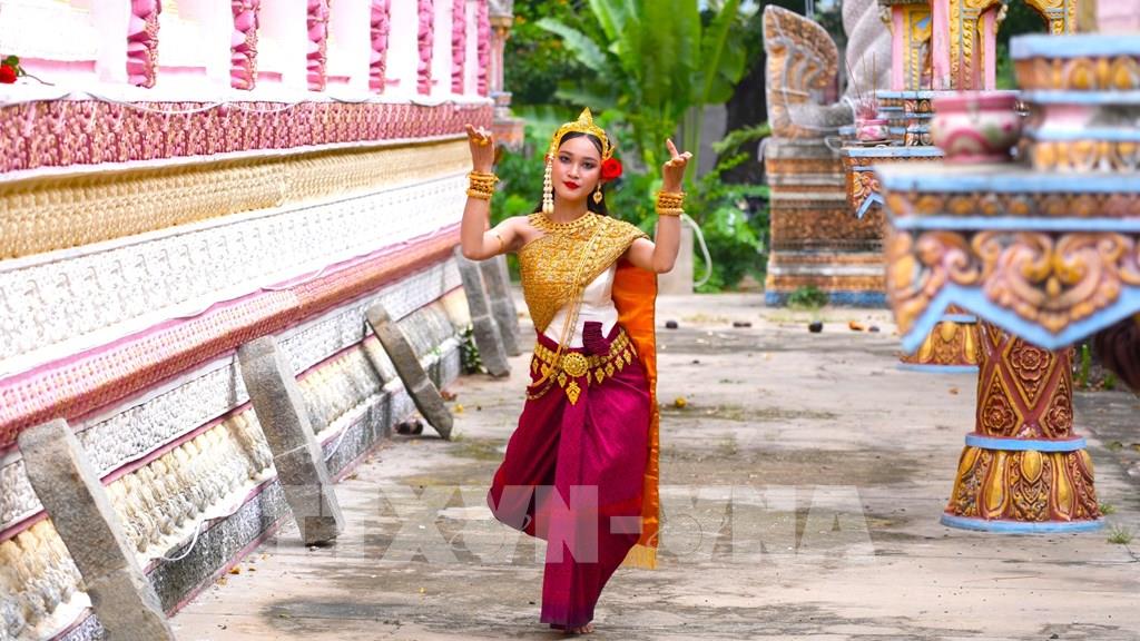 Thiếu nữ Khmer biểu diễn điệu múa Rô Băm, một trong những loại hình nghệ thuật truyền thống của đồng bào dân tộc Khmer. Ảnh: Minh Phú - TTXVN