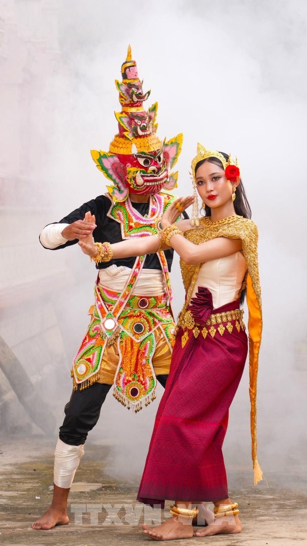 Trong múa Chằn, nhân vật nữ chính thường là Sita, người vợ xinh đẹp của Rama, là một biểu tượng của sự hiền thục, đức hạnh và là một phần không thể thiếu trong các câu chuyện về Ramayana mà múa Chằn thường tái hiện. Ảnh: Minh Phú – TTXVN