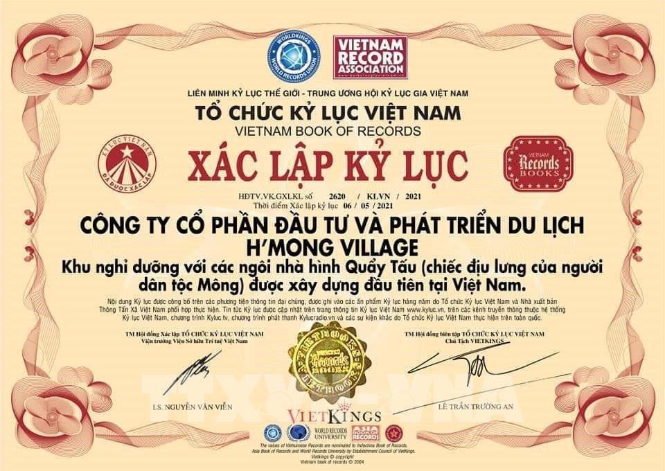 10:05' - 18/05/2021Tổ chức Kỷ lục Việt Nam vừa xác lập kỷ lục cho khu nghỉ dưỡng với các ngôi nhà hình Quẩy Tấu (chiếc địu lưng của người dân tộc Mông) được xây dựng đầu tiên tại Việt Nam thuộc Công ty CP đầu tư và Phát triển du lịch H’MONG VILLAGE, tọa lạc tại khu Tráng Kìm, xã Đồng Hà, huyện Quản Bạ, tỉnh Hà Giang. Khu nghỉ dưỡng hình Quẩy Tấu được xây dựng với 15 ngôi nhà nằm trong khuôn viên rộng hơn 20ha đã tạo cảnh quan thiên nhiên vô cùng sáng tạo và ấn tượng khi tới đây.