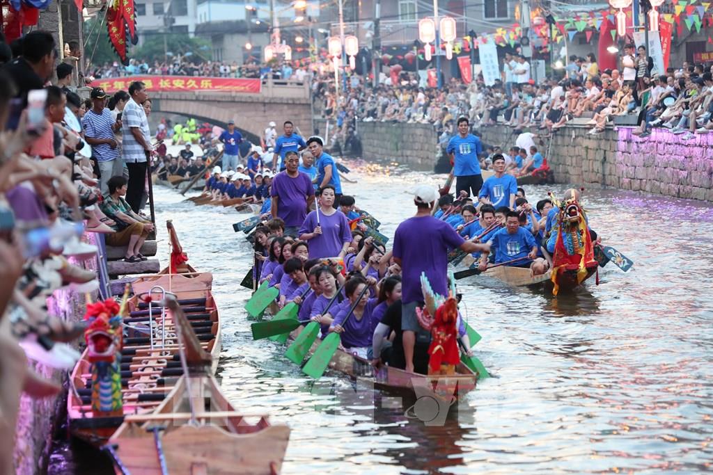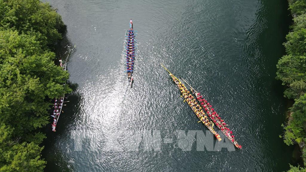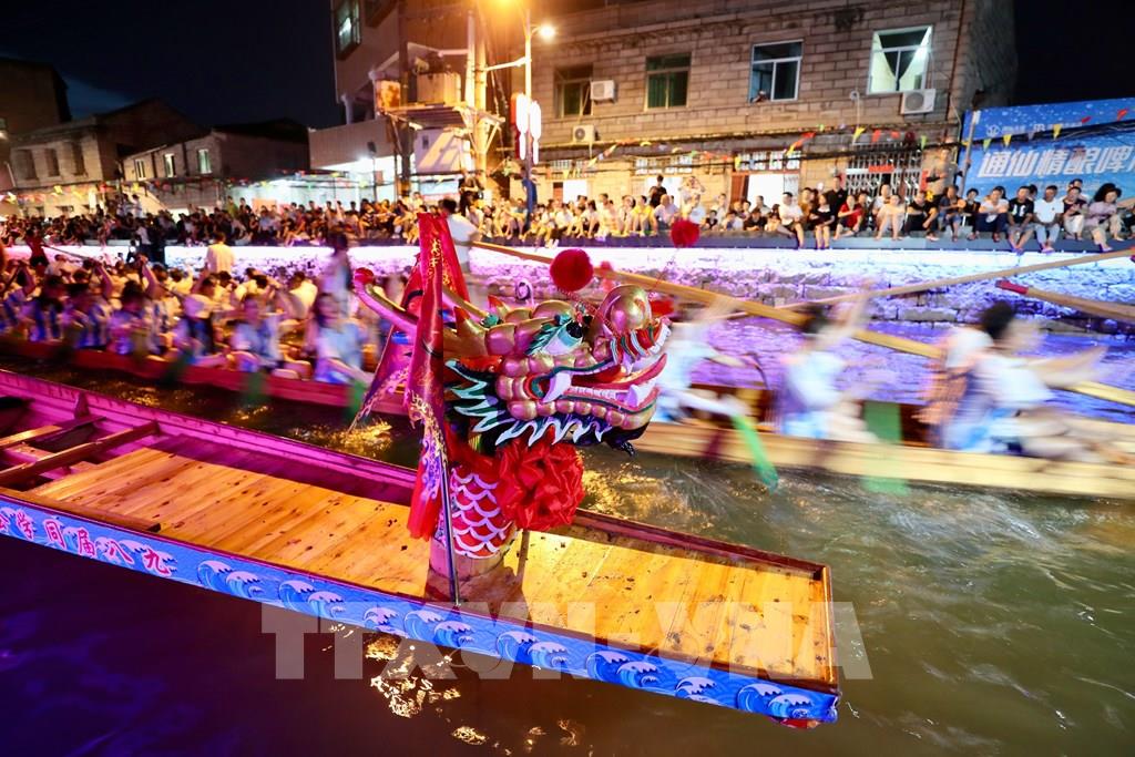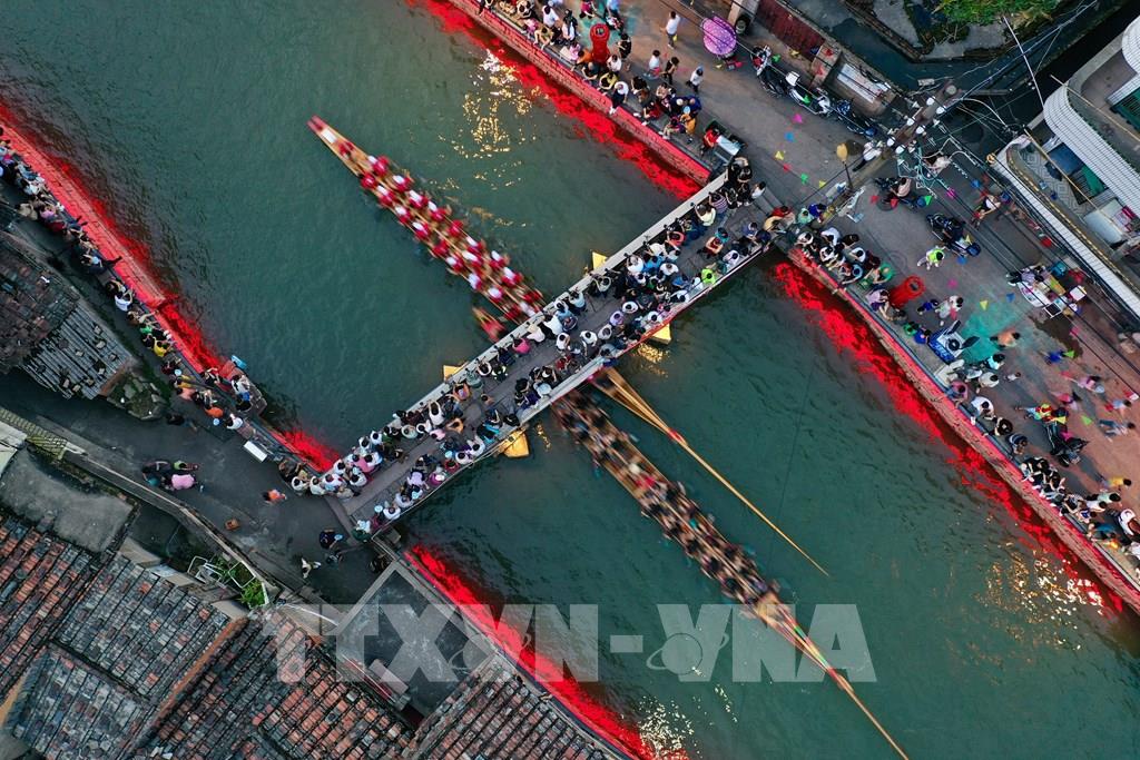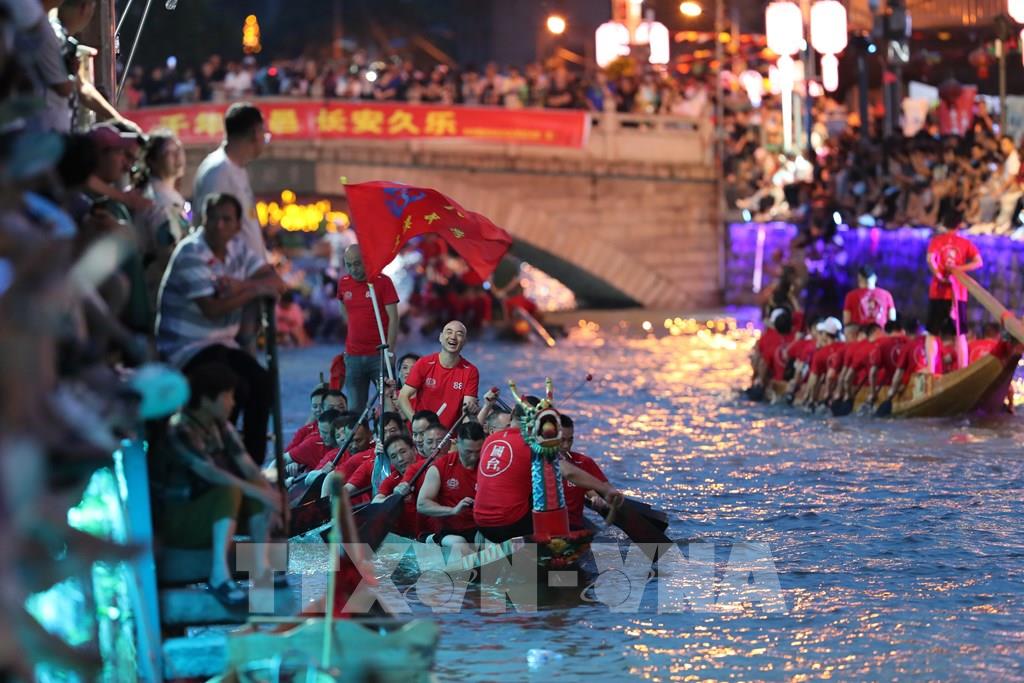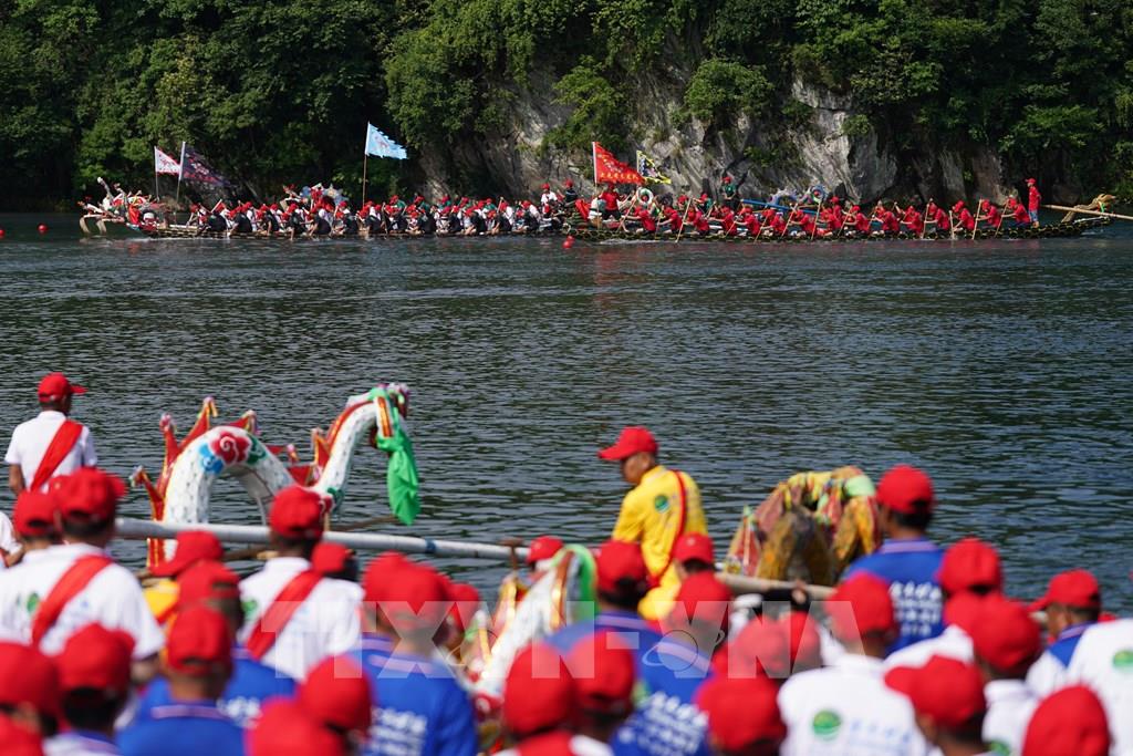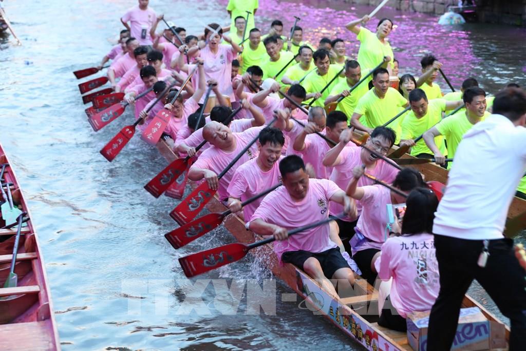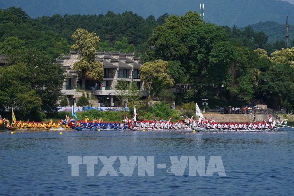 Hàng năm, cứ đến Tết Đoan Ngọ (5/5 âm lịch), người dân Trung Quốc lại tổ chức lễ hội Thuyền rồng trên khắp đất nước để cầu bình an và xua đuổi tà ma, bệnh tật... Điểm nổi bật của lễ hội là cuộc đua thuyền rồng trên sông.. Ảnh: THX/TTXVN