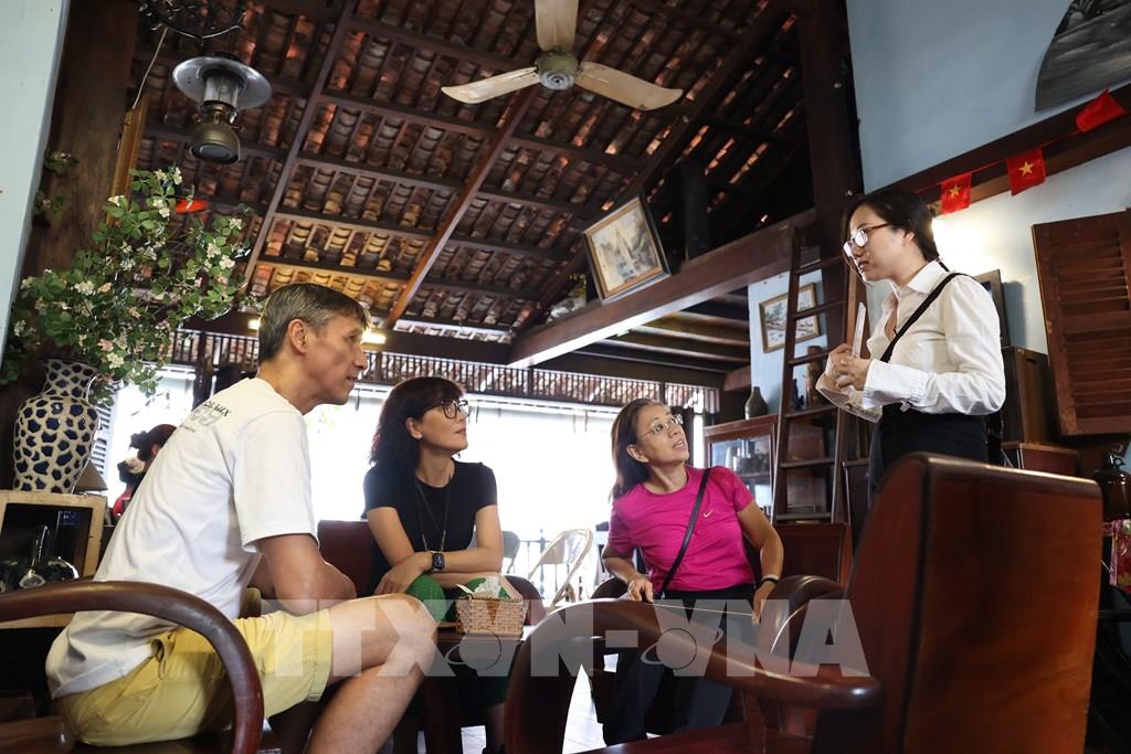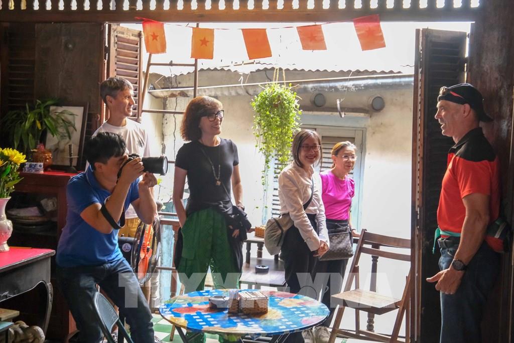 Du khách nước ngoài nghe giới thiệu về lịch sử của quán cà phê Đỗ Phủ và những câu chuyện về các chiến sĩ biệt động Sài Gòn. Ảnh: Thanh Tân - TTXVN