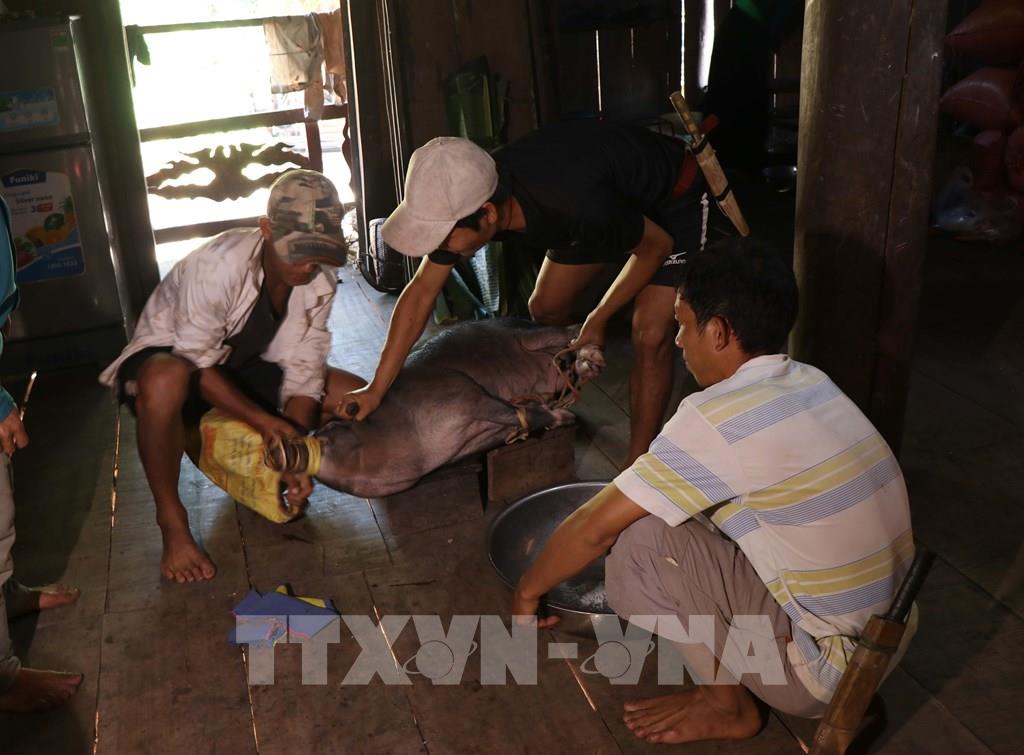 Chuẩn bị vật hiến sinh (lợn) để làm mâm cúng (đồ chín) mời các thần linh, tổ tiên về dự Tết hoa mào gà. Ảnh: Nguyễn Xuân Tiến-TTXVN