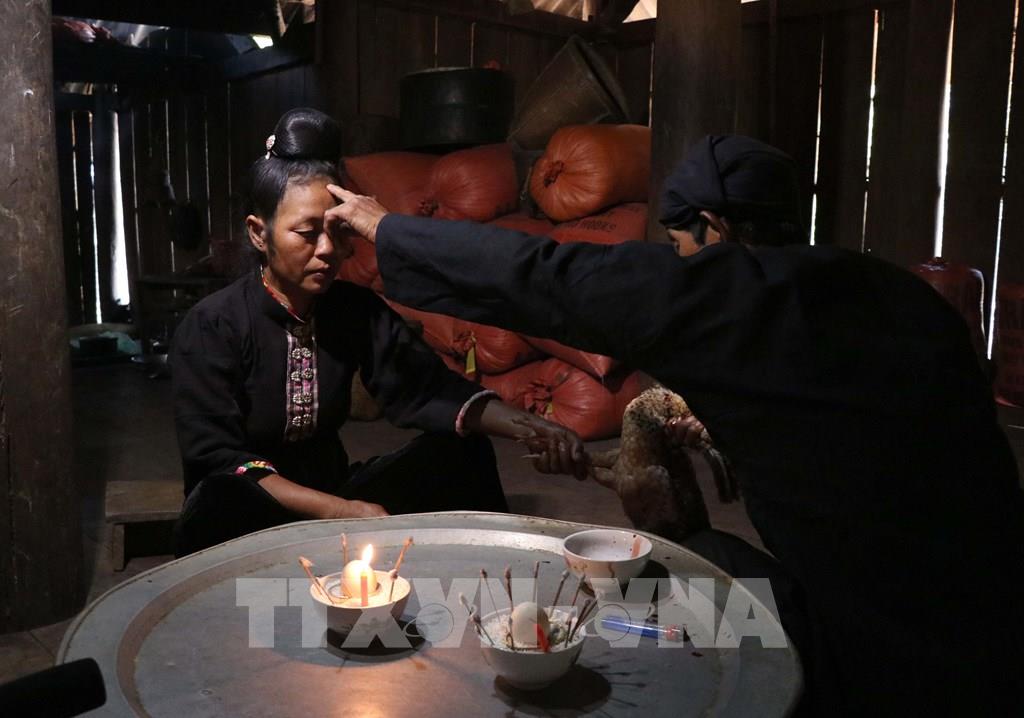 Thầy cúng lấy tiết gà đánh dấu lên trán cho gia chủ để cầu xin thần linh, tổ tiên phù hộ người trong gia đình gia chủ sang năm mới dồi dào sức khỏe, gặp nhiều điều an lành, may mắn. Ảnh: Nguyễn Xuân Tiến-TTXVN