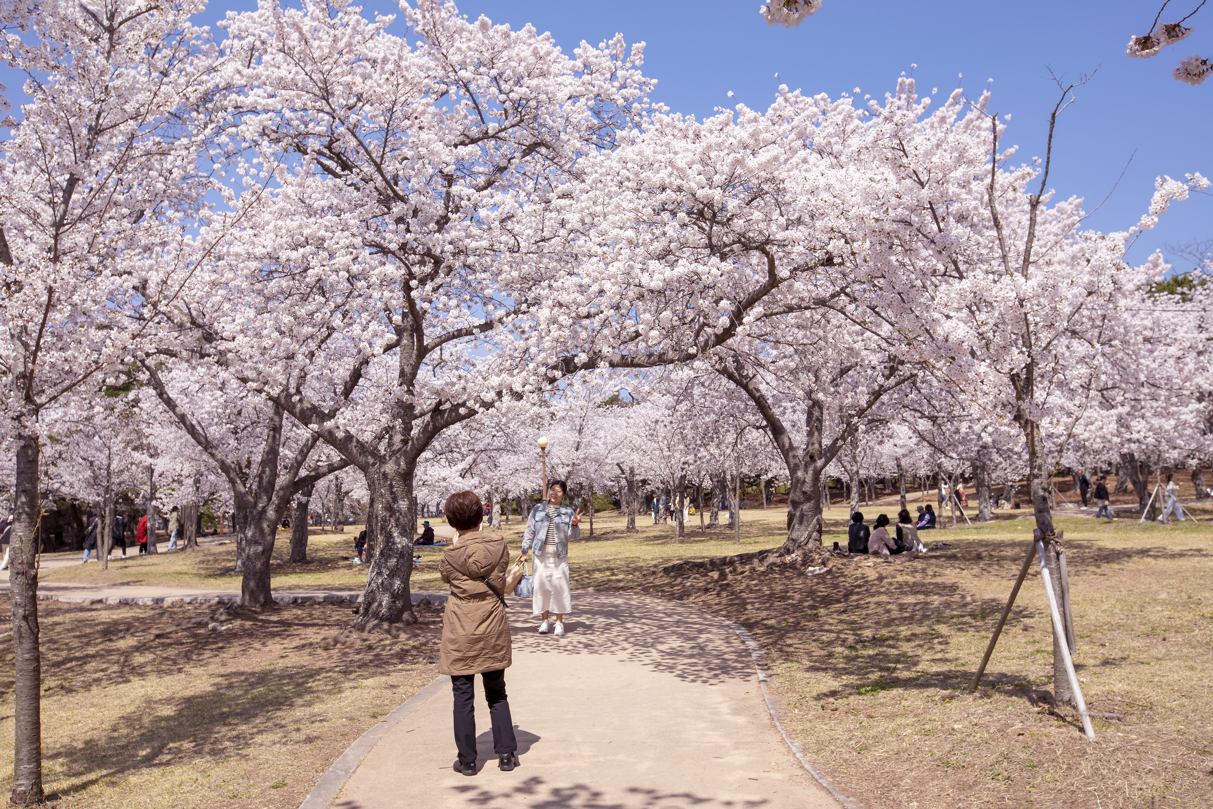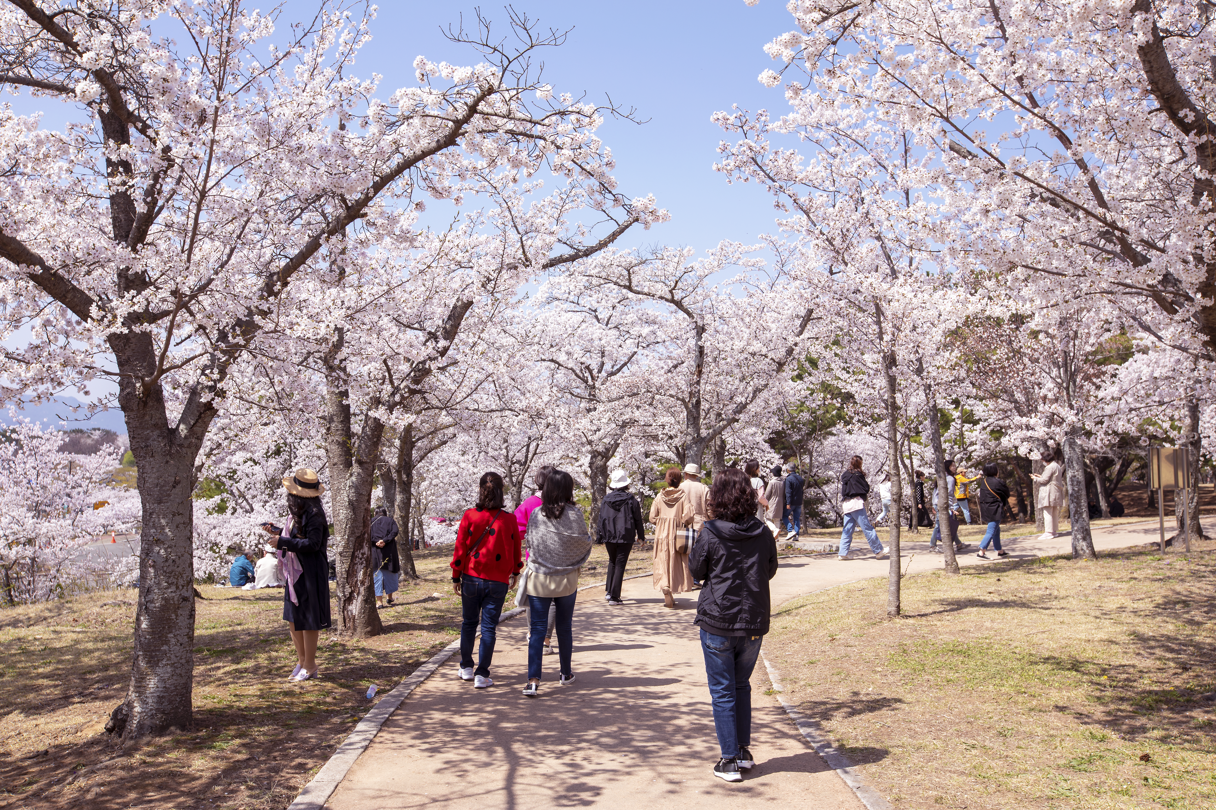 Người dân Hàn Quốc thích thú chụp ảnh check-in dưới tán hoa anh đào ở Gyeongju. Ảnh Anh Nguyên - TTXVN