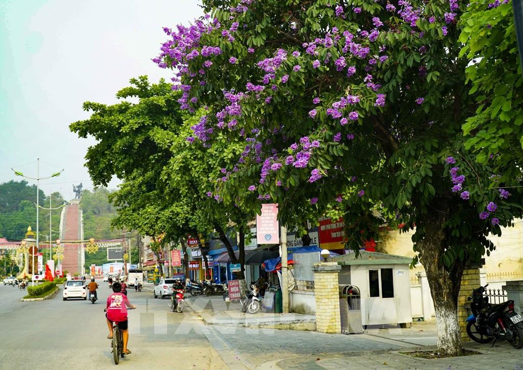 Hoa bằng lăng nở khoe sắc tím trên đường Trần Đăng Ninh, trước lối lên Tượng đài Chiến thắng Điện Biên Phủ. Ảnh: Xuân Tư – TTXVN