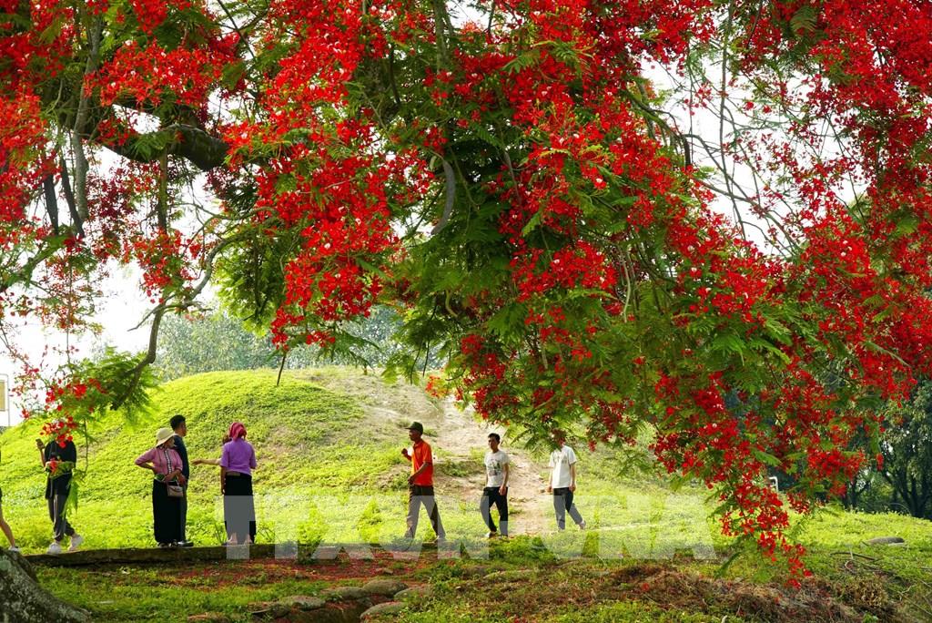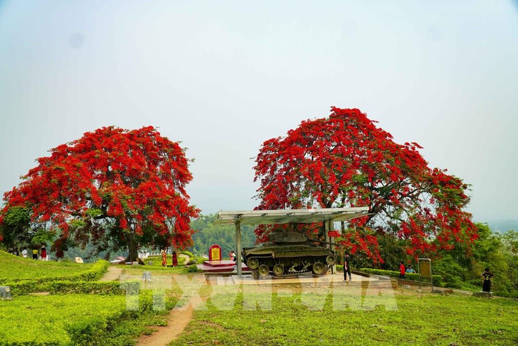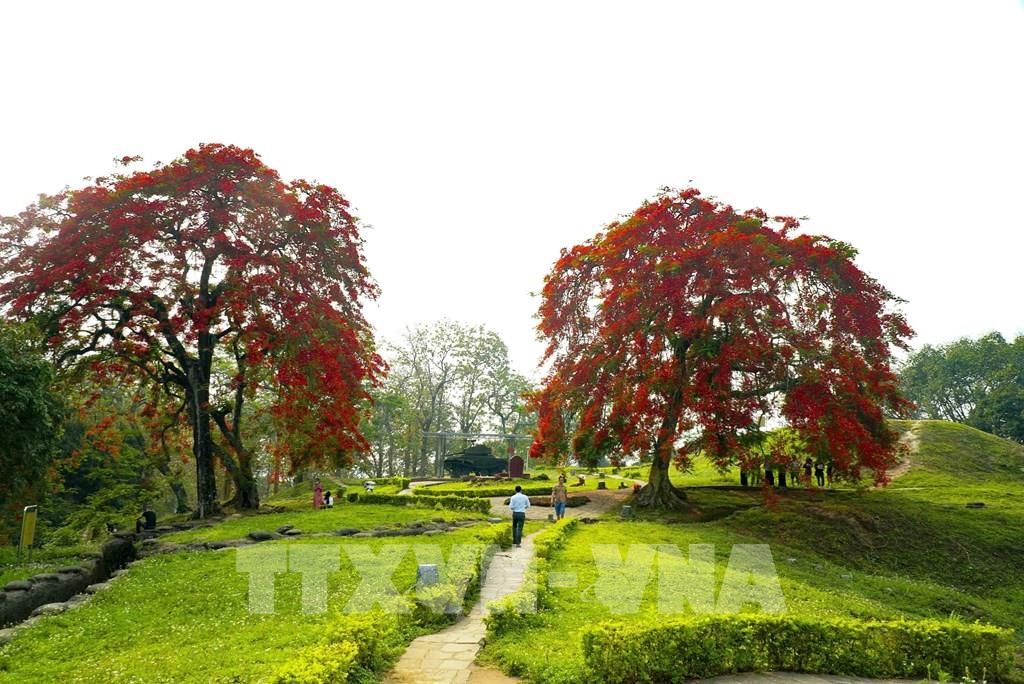 Hoa phượng nở đỏ tạo cảnh quan đẹp, thu hút du khách tham quan Di tích Đồi A1. Ảnh: Xuân Tư – TTXVN