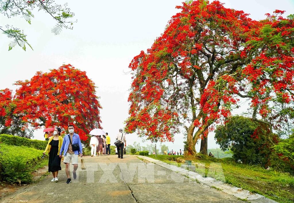 Du khách tham quan và ngắm hoa phượng nở trên Đồi A1. Ảnh: Xuân Tư – TTXVN