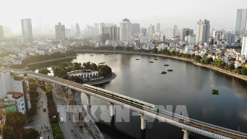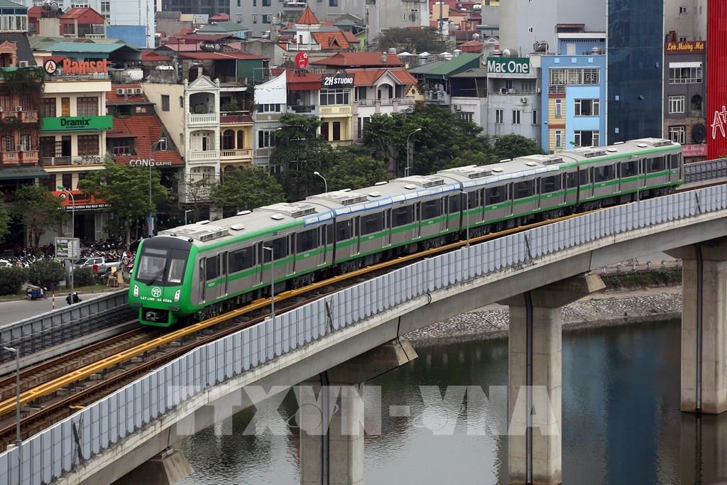 Đoàn tàu đang rời ga La Thành. Mỗi đoàn tàu có 4 toa, sức chở hơn 900 người, vận tốc thiết kế 80km/giờ và vận tốc khai thác thương mại trung bình 35km/giờ. Ảnh: Huy Hùng - TTXVN