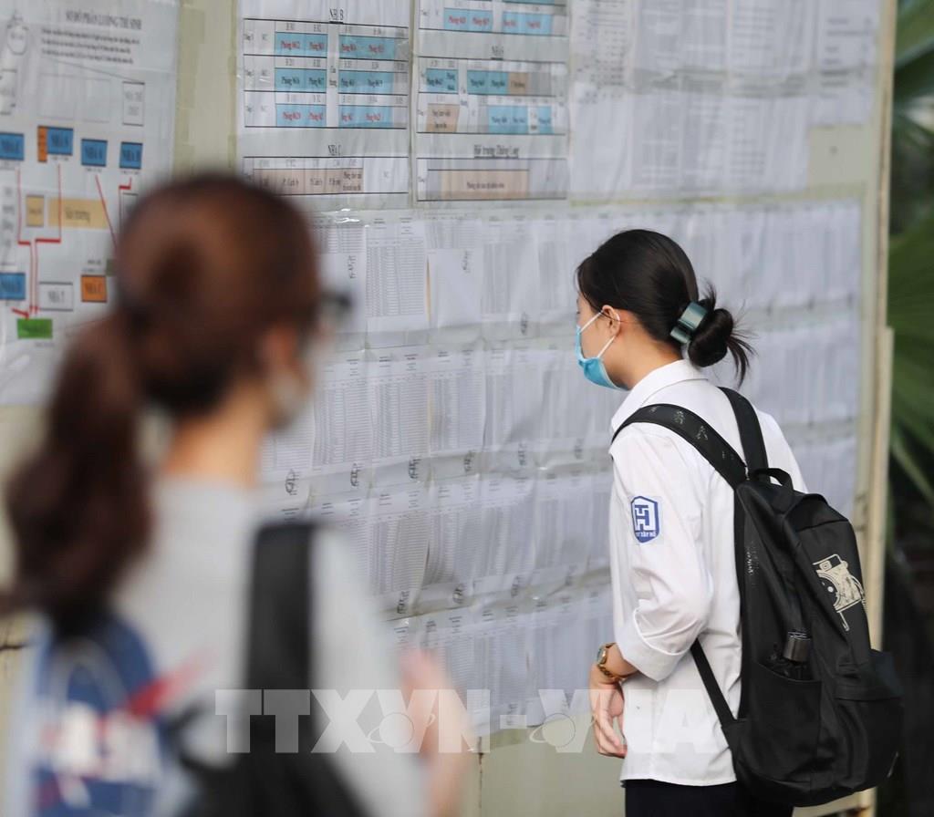 Kiểm tra danh sách thí sinh trước khi vào phòng thi tại điểm thi Trường THPT Thăng Long. Ảnh: Hoàng Hiếu - TTXVN