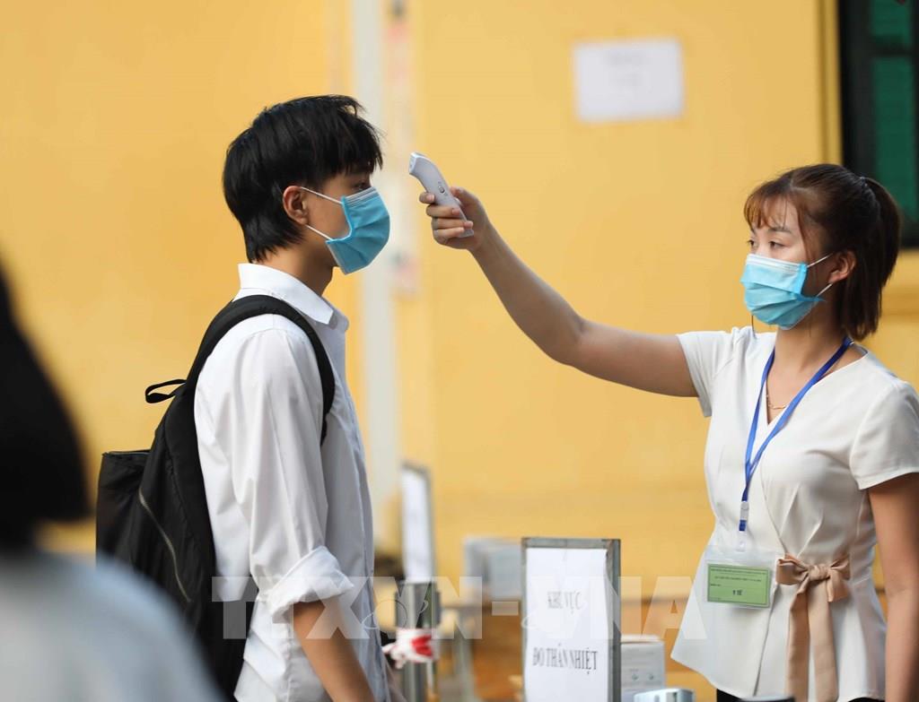 Đo thân nhiệt cho thí sinh khi tới điểm thi trường THPT Chu Văn An. Ảnh: Thanh Tùng - TTXVN