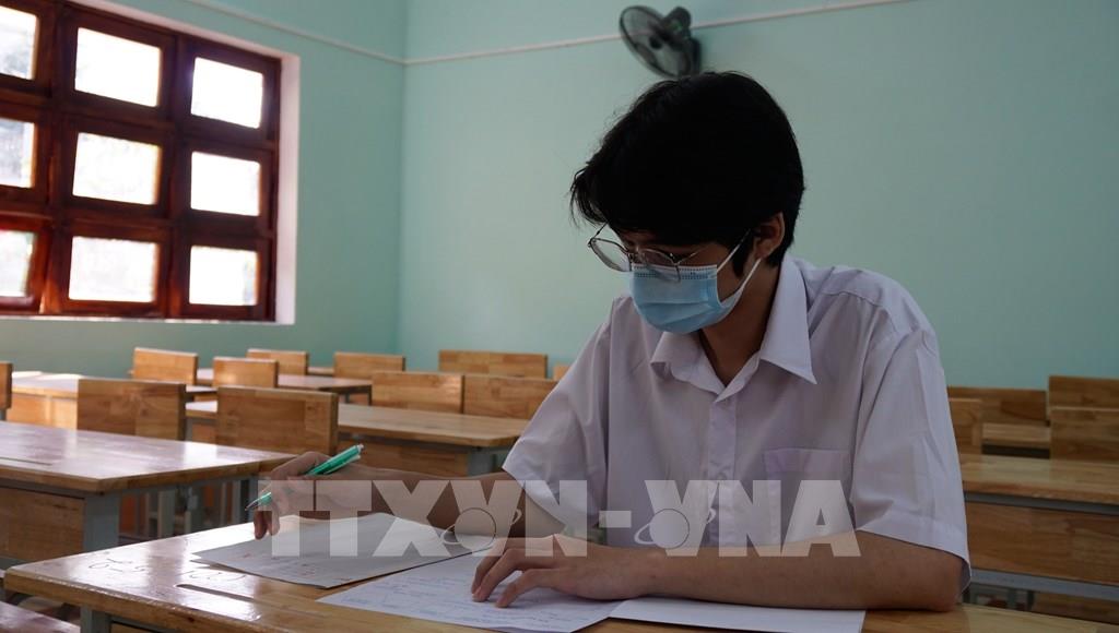 Mỗi phòng thi có 24 thí sinh ngồi giãn cách để phòng dịch tại điểm thi trường THPT Ngô Sỹ Liên (Bắc Giang). Ảnh: Danh Lam - TTXVN