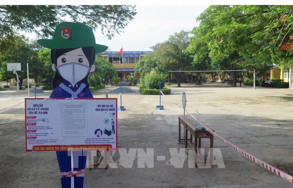 Điểm thi trường THCS Trần Hưng Đạo dừng thi do có trường hợp nghi dương tính với SARS-CoV-2. Ảnh: Xuân Triệu - TTXVN