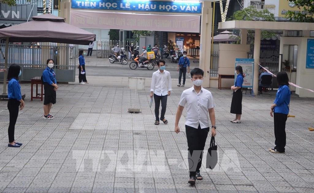 Thí sinh được yêu cầu giãn cách khi vào điểm thi trường THPT Trần Phú (thành phố Đà Nẵng). Ảnh: Văn Dũng - TTXVN