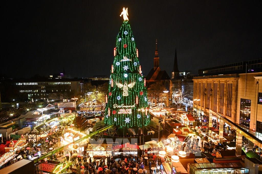 Cây thông Noel được trang hoàng rực rỡ tại Chợ Giáng sinh ở Dortmund, Đức, ngày 27/11/2023. Ảnh: AFP/TTXVN