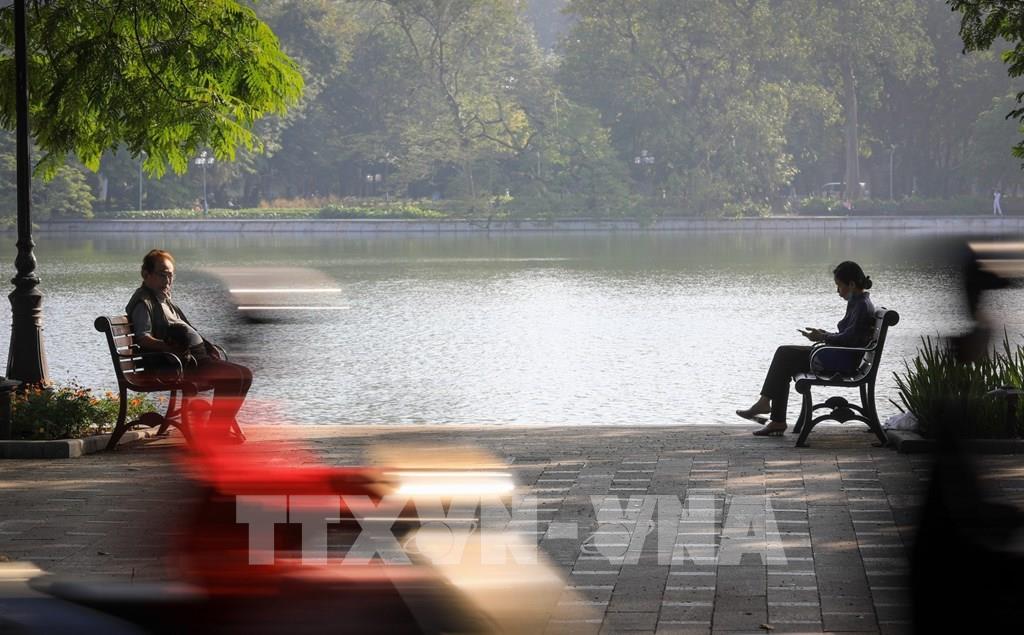 Người dân Thủ đô thư thái ngồi cảm nhận ánh nắng ban mai và tiết thu se lạnh ở hồ Hoàn Kiếm. Ảnh: Thành Đạt - TTXVN