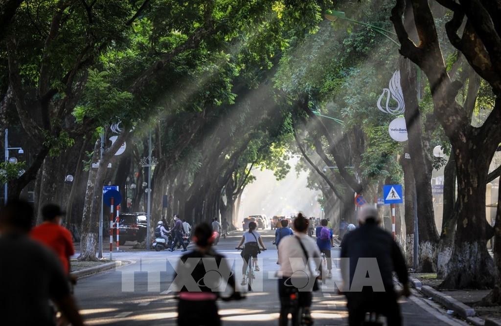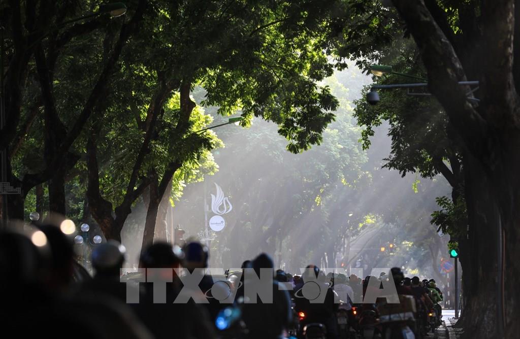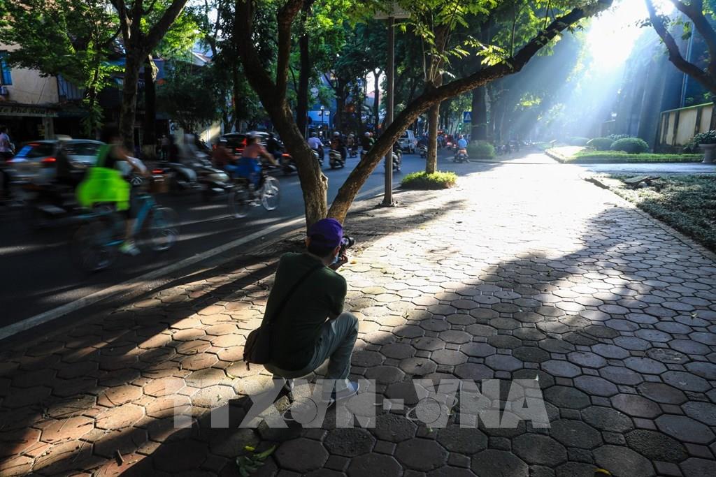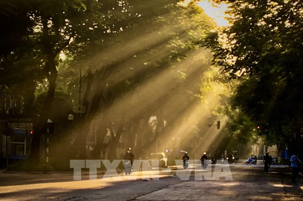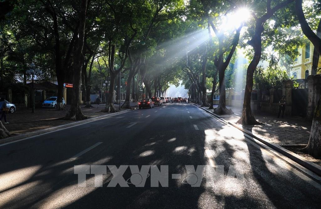 Những tia nắng sớm thu vàng ươm đẹp mê hồn trải dài trên con đường Lý Thường Kiệt. Ảnh: Hải Anh - TTXVN