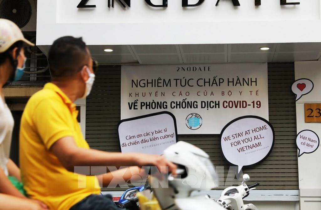 Một cửa hàng trên phố Hàng Lược, quận Hoàn Kiếm treo thông báo đóng cửa theo quy định, và cổ động người dân chấp hành phòng chống dịch bệnh Covid-19. Ảnh: Lâm Khánh - TTXVN ;
