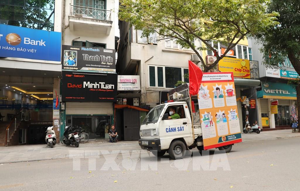 Xe lưu động của phường Hàng Buồm, quận Hoàn Kiếm nhắc nhở chủ cơ sở kinh doanh đóng cửa hàng theo quy định. Ảnh: Lâm Khánh - TTXVN