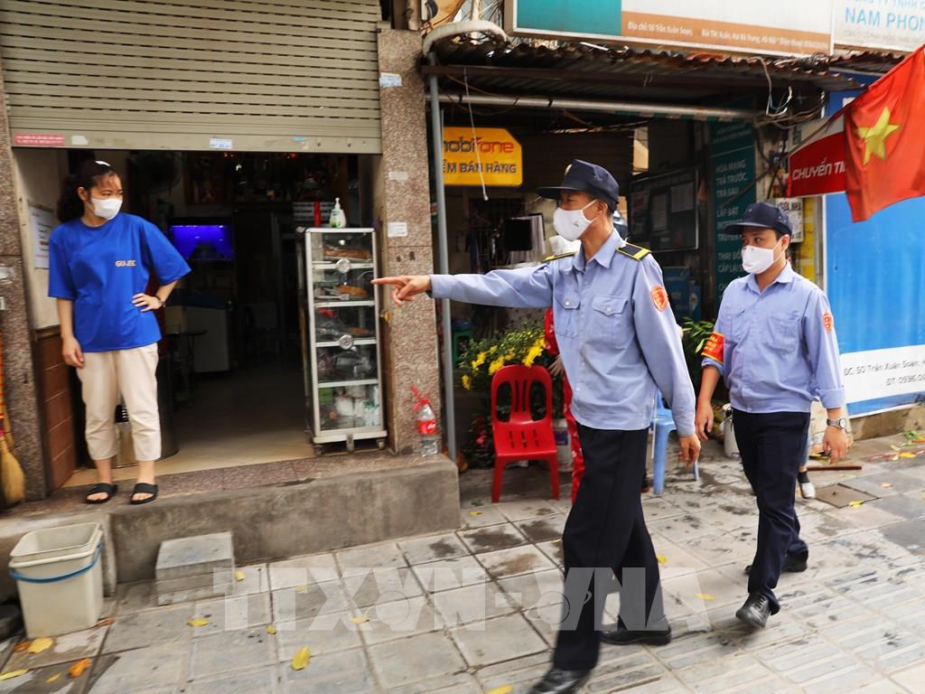 Lực lượng chức năng của phường Phạm Đình Hồ, quận Hai Bà Trưng nhắc nhở người dân đóng cửa hàng theo quy định. Ảnh: Lâm Khánh - TTXVN ;