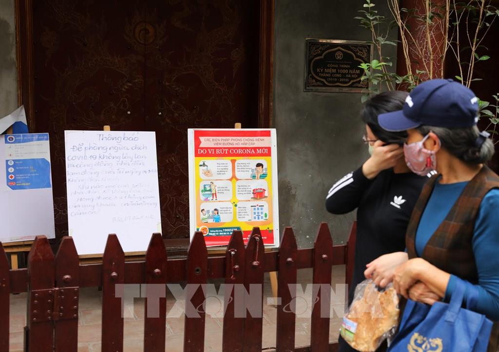 Đền Bạch Mã (phố Hàng Buồm, quận Hoàn Kiếm) thông báo đóng cửa theo quy định và hướng dẫn người dân phòng, chống dịch bệnh Covid-19. Ảnh: Lâm Khánh - TTXVN