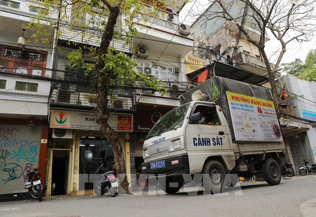 Xe lưu động của phường Hàng Buồm, quận Hoàn Kiếm nhắc nhở chủ cơ sở kinh doanh đóng cửa hàng theo quy định. Ảnh: Lâm Khánh - TTXVN ;
