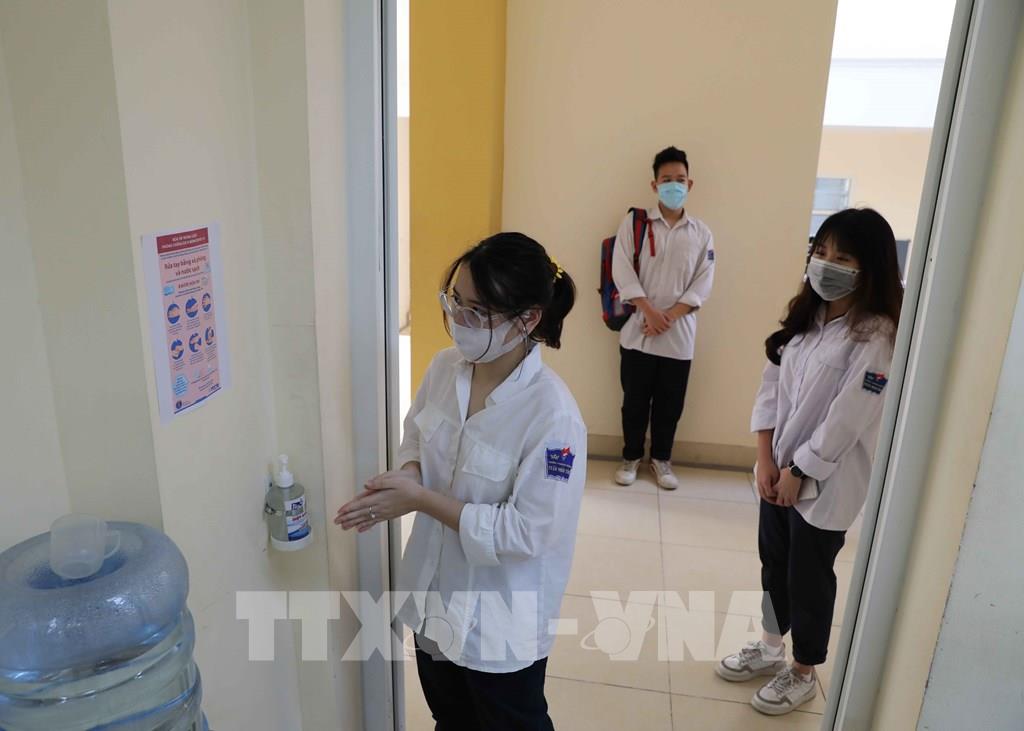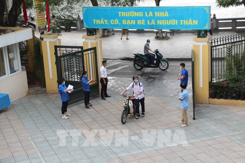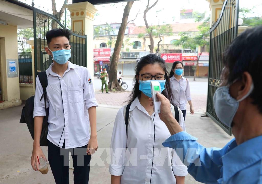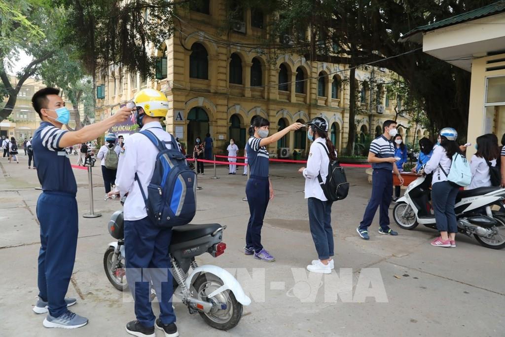 Học sinh trường THPT Việt Đức, quận Hoàn Kiếm được đo kiểm tra thân nhiệt trước khi vào trường theo đúng quy định. Ảnh: Thành Đạt - TTXVN