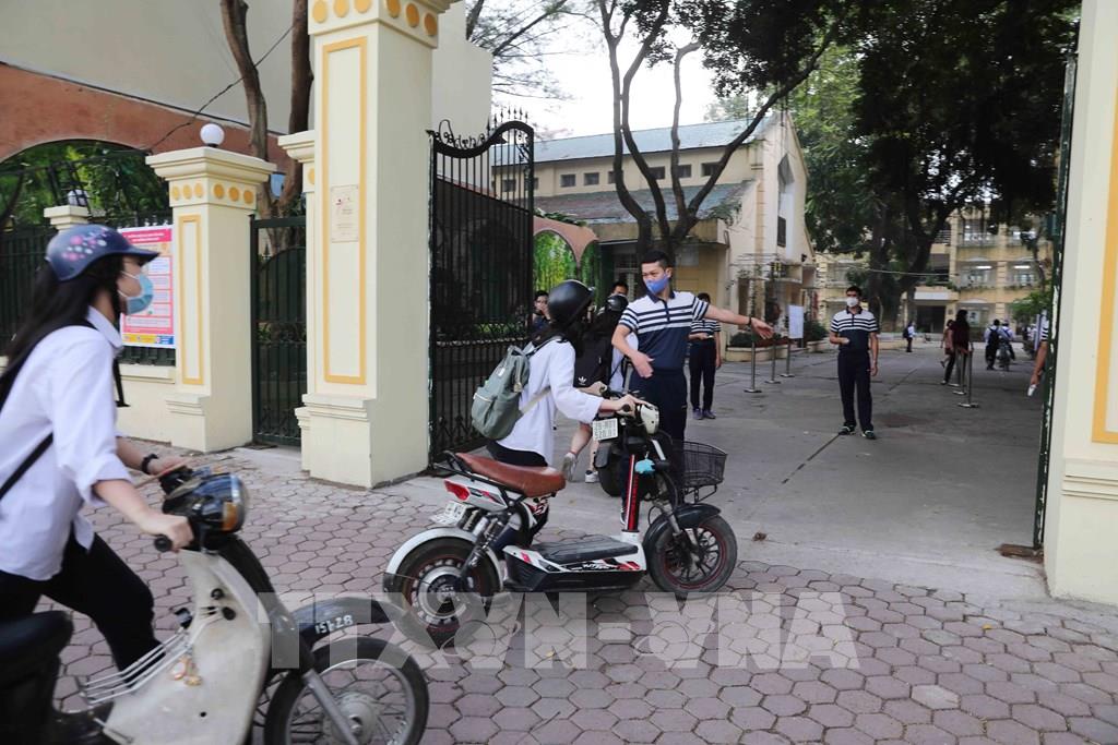 Học sinh trường THPT Trần Nhân Tông, quận Hai Bà Trưng trở lại trường sáng 4/5. Ảnh: Thanh Tùng - TTXVN