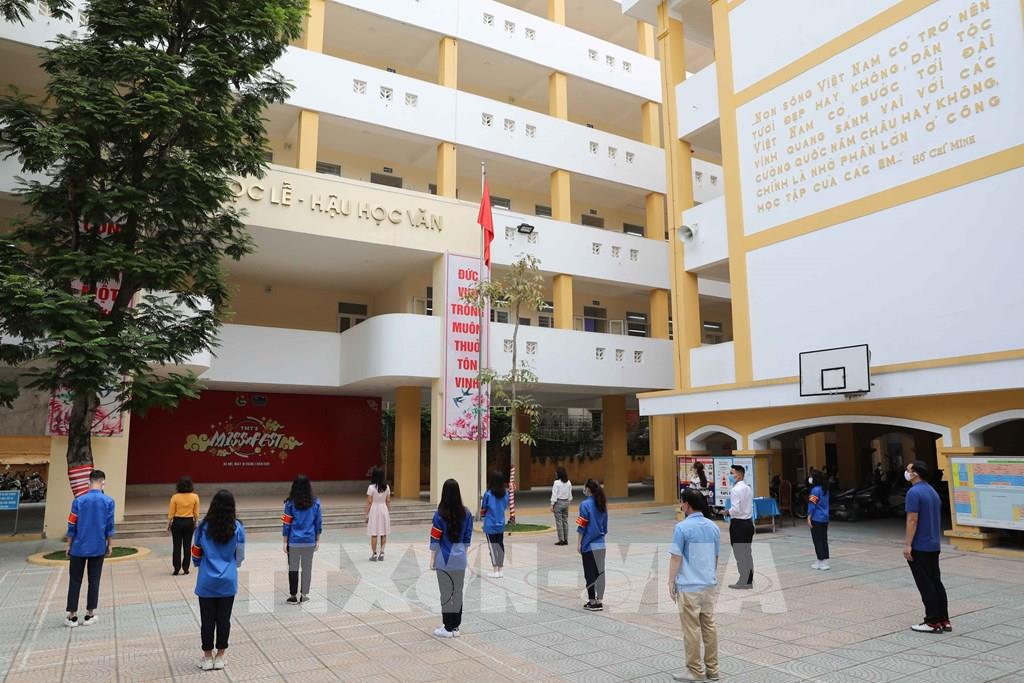 Giáo viên trường THPT Trần Nhân Tông, quận Hai Bà Trưng chào cờ đầu tuần đảm bảo giãn cách tối thiểu. Ảnh: Thanh Tùng - TTXVN