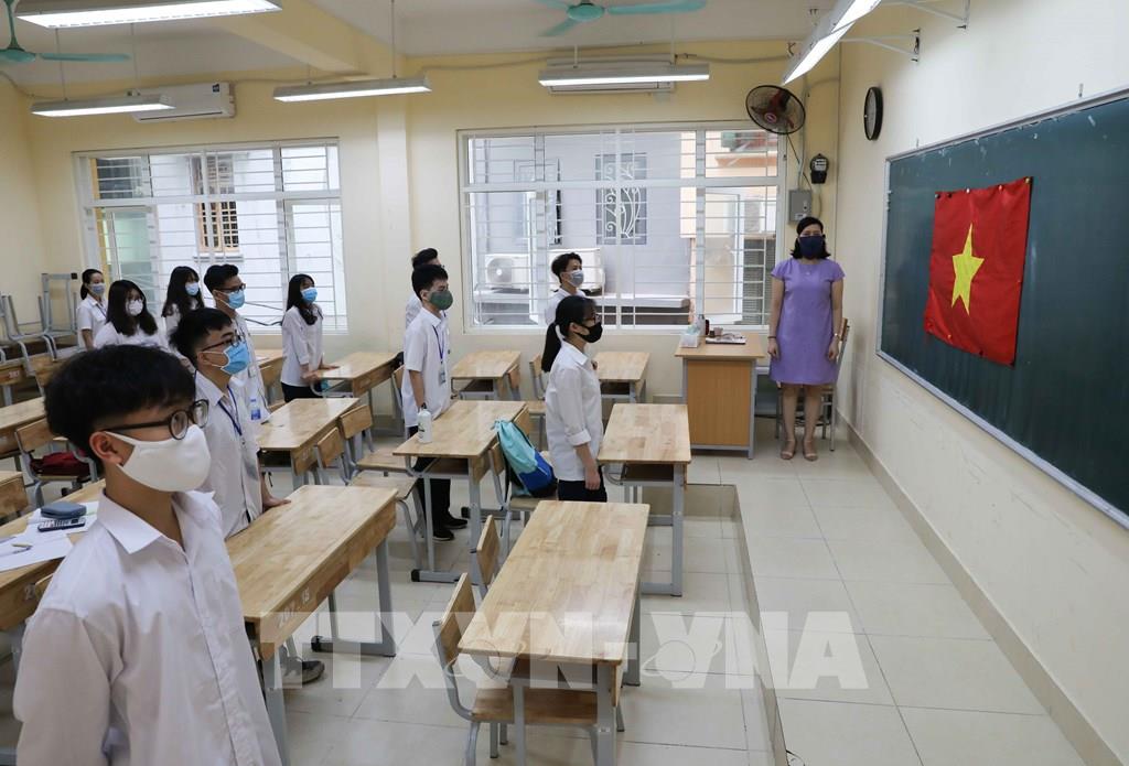 Học sinh Trường THPT Trần Nhân Tông, quận Hai Bà Trưng chào cờ đầu tuần trong lớp học, đảm bảo giãn cách tối thiểu. Ảnh: Thanh Tùng - TTXVN