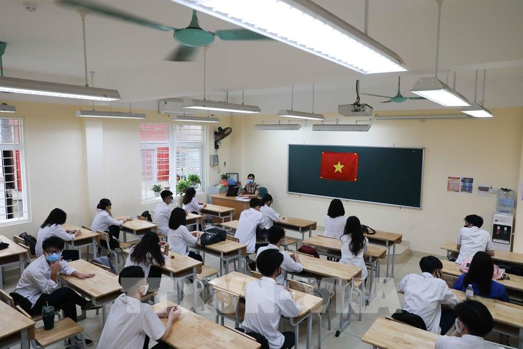 Các lớp học đều đảm bảo giãn cách học sinh, được mở cửa thông thoáng, sử dụng quạt thay cho điều hòa theo khuyến cáo của ngành y tế. Ảnh: Thanh Tùng - TTXVN