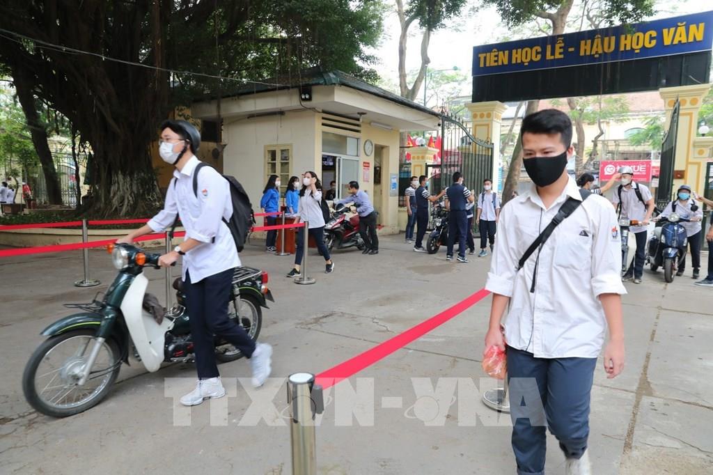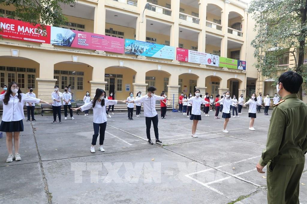 Các em học sinh Trường THPT Việt Đức đảm bảo giãn cách cần thiết khi vào trường. Ảnh: Thành Đạt - TTXVN