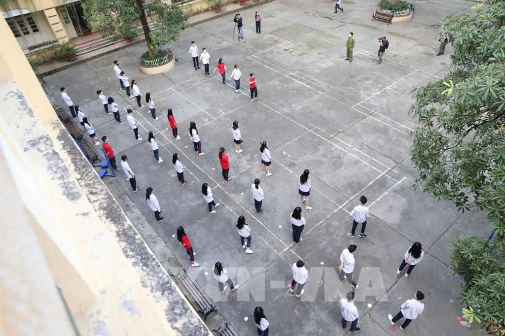 Tiết học quân sự tại trường THPT Việt Đức đảm bảo giãn cách cần thiết. Ảnh: Thành Đạt - TTXVN