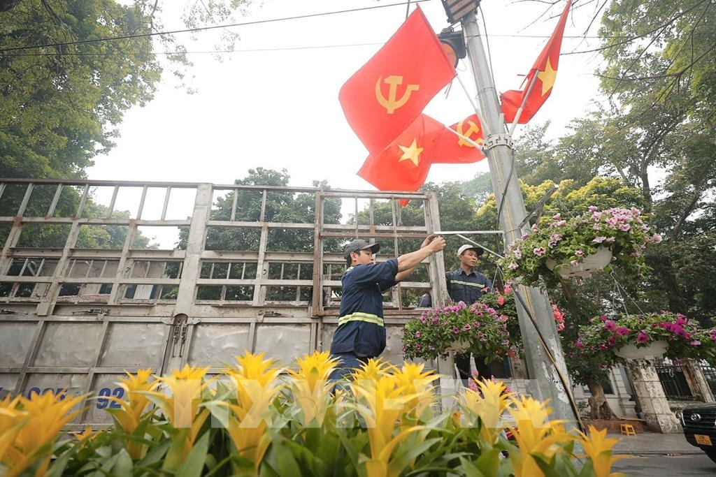 Người dân tổ dân phố phường Ô Chợ Dừa trang trí cờ, chào mừng Đại hội XIV của Đảng. Ảnh: Minh Quyết - TTXVN