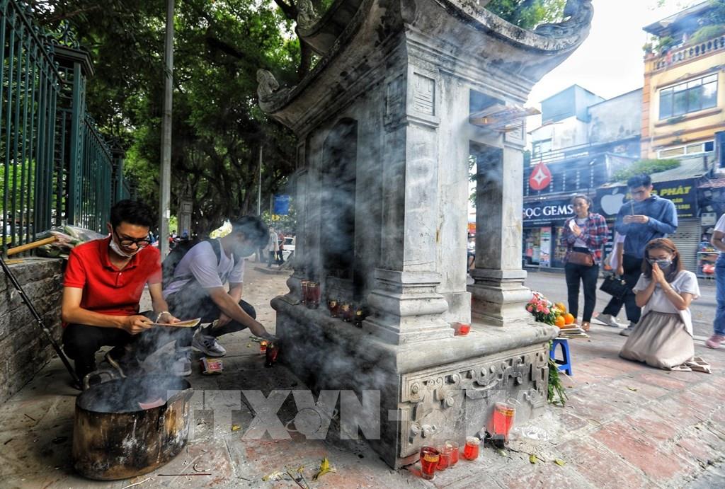 Nhiều gia đình còn mang cả đồ lễ, vàng mã đến làm lễ tại Văn Miếu. Ảnh: Thành Đạt - TTXVN