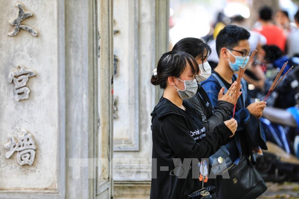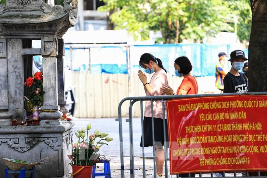 Các điểm di tích chưa mở cửa, phụ huynh và sĩ tử chỉ đặt lễ, dâng hương vái vọng bên ngoài cửa Văn Miếu - Quốc Tử Giám. Ảnh: Thành Đạt - TTXVN
