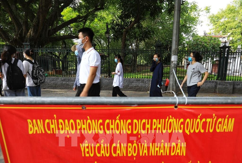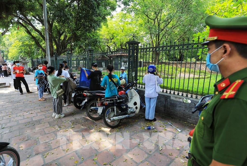 Trước cửa Văn Miếu, phụ huynh và các sĩ tử đến lễ khá đông dù đã có khuyến cáo của Ban Chỉ đạo phòng, chống dịch phường Quốc Tử Giám. Ảnh: Thành Đạt - TTXVN