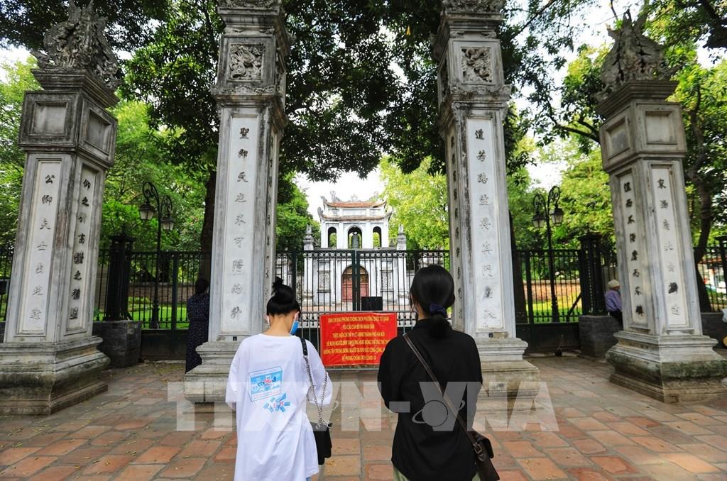 Trước cửa Văn Miếu phụ huynh và các sĩ tử đến lễ khá đông dù đã có thông báo của Ban Chỉ đạo phòng, chống dịch COVID-19 phường Quốc Tử Giám. Ảnh: Thành Đạt - TTXVN