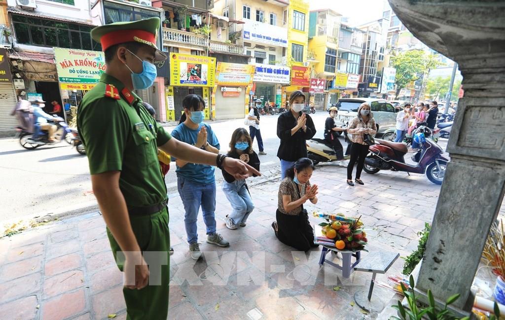 Lực lượng Công an phường Quốc Tử Giám nhắc nhở người dân không tụ tập, đứng giãn khoảng cách khi làm lễ. Ảnh: Thành Đạt - TTXVN