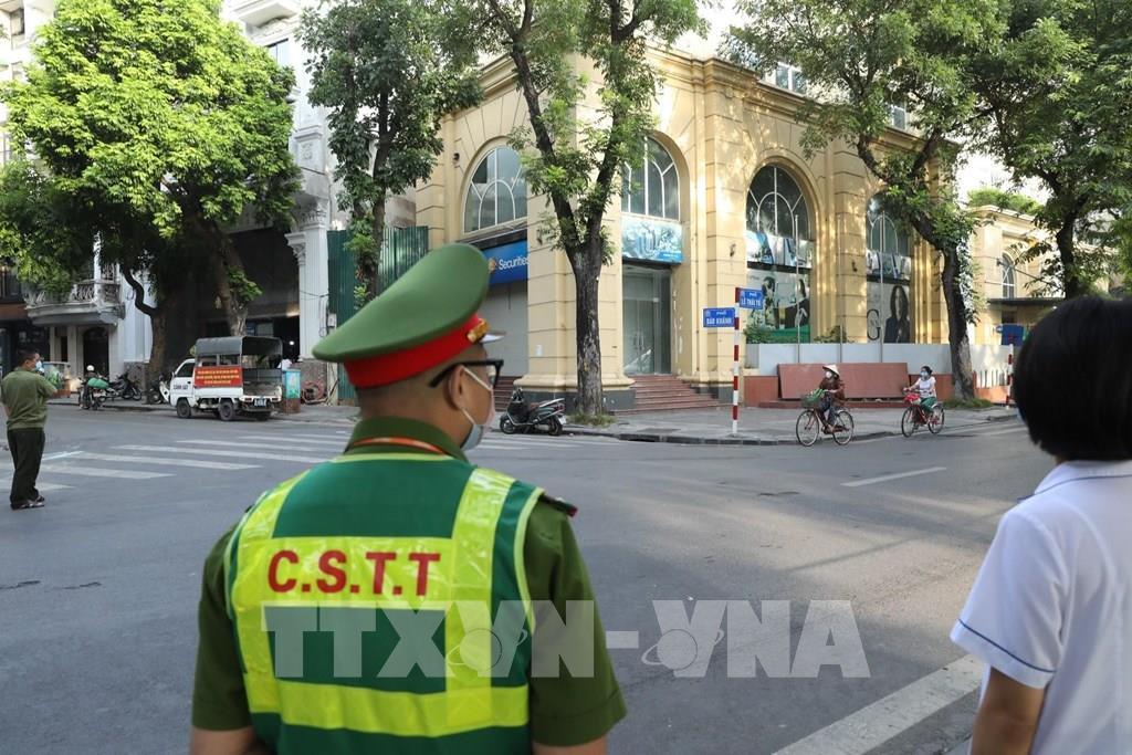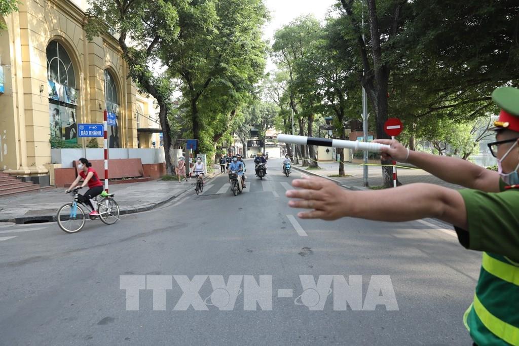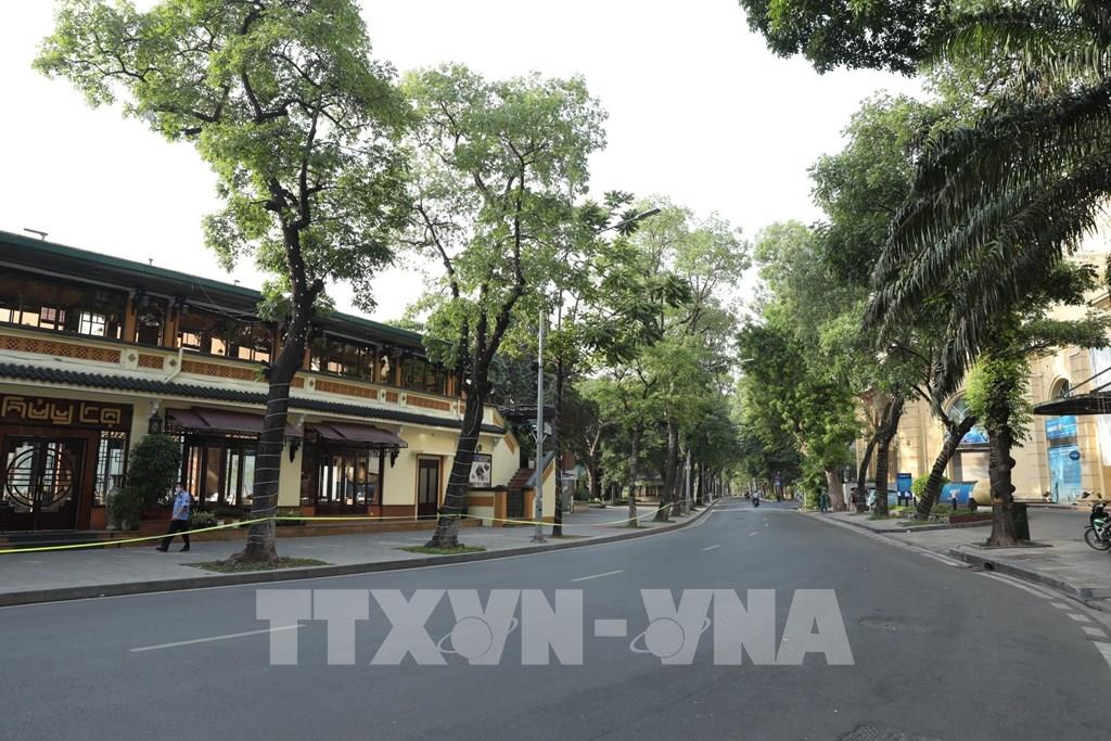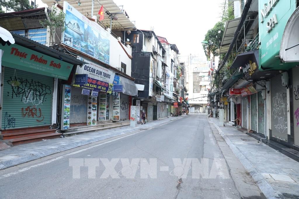Đường phố vắng người đi lại trước giờ đi làm trong ngày đầu thực hiện (ảnh chụp sáng sớm 19/7/2021, tại phố Đinh Liệt). Ảnh: Minh Quyết - TTXVN